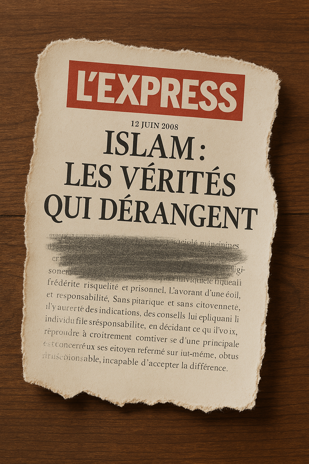 Ainsi, le dernier numéro de L’Express, daté du 12 juin, n’a pas échappé à l’œil particulièrement bienveillant de nos Gardiens du Temple. Cette fois, il ne s’agissait pas de Persépolis ou d’une « atteinte à un pays-frère », d’un livre qui puisse pousser une Église deux fois millénaire à la disparition, du discours d’un rabbin juif qui puisse nous révéler l’existence d’un réalité qui s’appelle Israël à nos frontières, ou encore d’une actrice se baladant en tenue d’Ève avant de découvrir, avec son bel étalon de partenaire, les joies insondables du plaisir (que nous ignorons, puisque nous sommes bien évidemment tous chastes, purs et innocents, et que nous n’avons jamais osé laisser nos yeux errer sur une femme ou un homme dans la plus simple appareil, voyons… !).